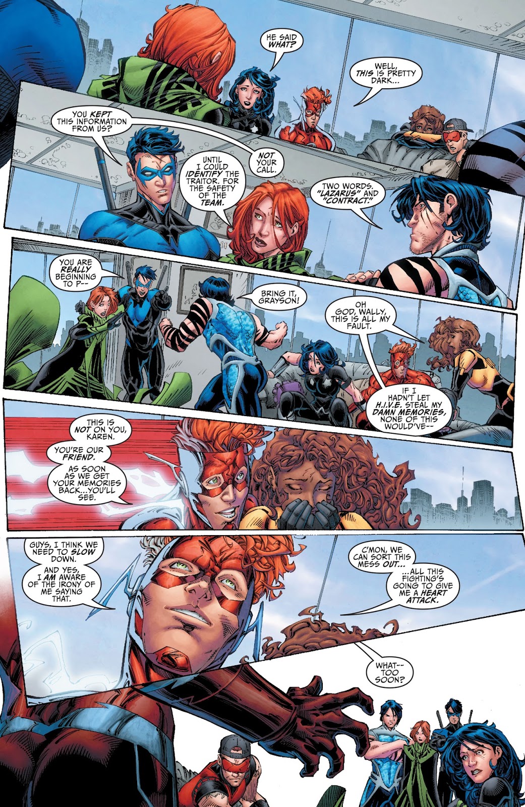 “THINGS FALL APART!” With a traitor in their midst, the Titans reach their breaking point as Nightwing reveals his shocking prime suspect! As tempers flare and distrust spreads, the team is forced to face a new conspiracy—and the Titans must save Manhattan from the nefarious Trident!