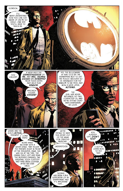 The issue opens up with some classic Commissioner Gordon and Batman interaction. You know, Batman sneaking up on Jim while he stands next to the lit Bat Signal! If you haven't seen it much before, it's bound to give you a chuckle, but the laughs end there. It seems this story is about a kidnapping and it's up to Batman to solve the case.