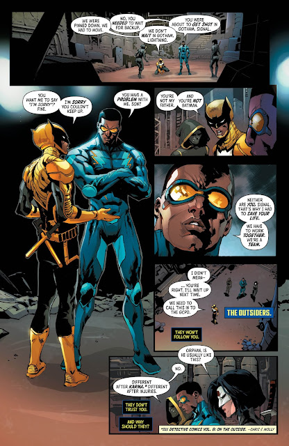 When the quest for justice drives Batman into some morally ambiguous areas, he calls in the most moral man he knows: Jefferson Pierce, a.k.a. Black Lightning, and his team of operatives known as the Outsiders! Several years ago Batman personally put the Barrera family into hiding after they suffered through terrible experiments at the hands of an organization called the Ark. Now all but one of them have turned up dead...and Batman needs to locate Sofia Barrera before the wrong people get their hands on her-and her surprising power! But it wouldn't be Batman without a hidden agenda, would it? And when Black Lightning, Katana, the Signal and Orphan find out what Batman is really up to, their every loyalty will be called into question.